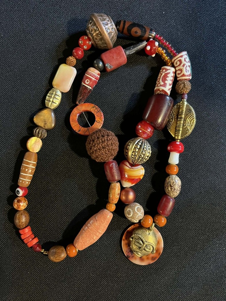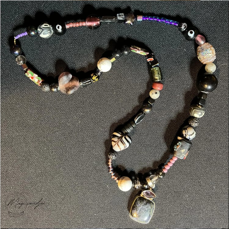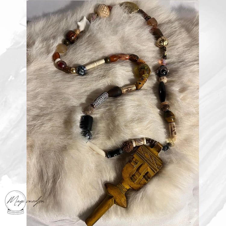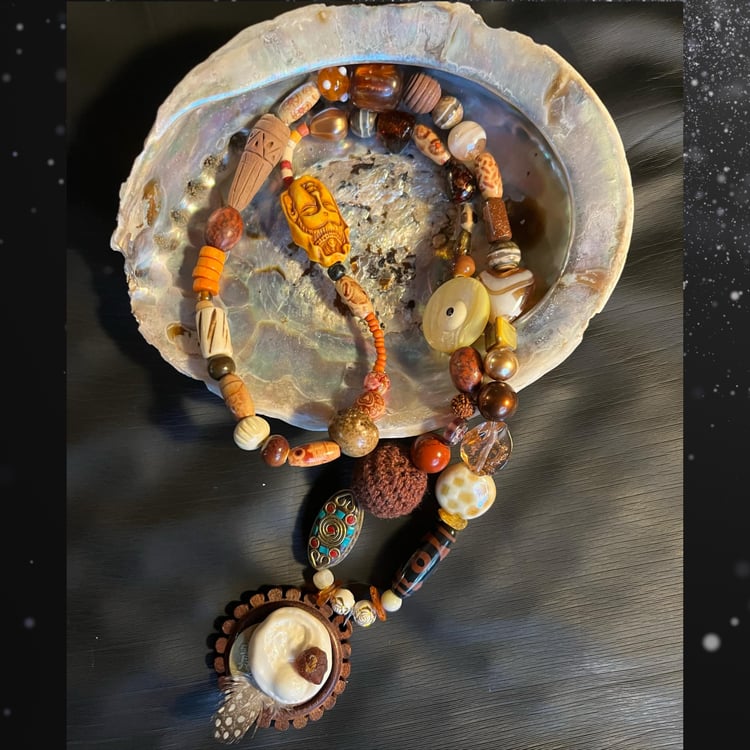 Halskæden har et kenyansk messingvedhæng på en skalbaggrund, der er indsat en bakelitperle fra en vintage islamisk bønnekæde, to kenyanske glasperler med betydningen ”Undtagen gud” samt ”Ydmyghed og styrke”, to treøjede dzi-perler for manifestation af succes og balance mellem krop, sind og ånd, rudrakshafrø, der repræsenterer åndelig vækst , indre fred og guddommelig beskyttelse. Desuden er der ben og hornperler importeret fra en indfødt amerikansk producent, glas, keramik, skal, nødder, garn og træ i kæden, der er healet til sangen ”Morning Queen Energy” med masser af taknemlighedsbekræftelser. Må du opleve dyb healing af den måde, du ser dig selv ❤️🦄